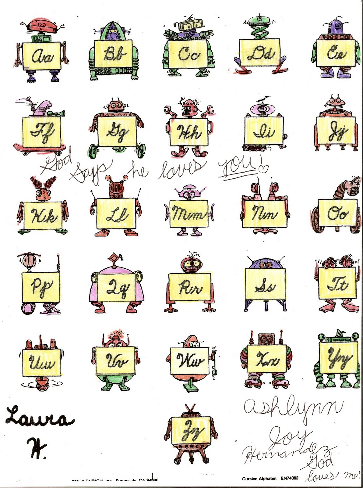A few days later, I was laminating some student work and feeling pretty overwhelmed by the long list of things I needed to do before heading home. The papers I was sending through were just some cursive pages for my kids to color and keep as a reference for when they’re practicing cursive- an art that I refuse to let die. It’s actually a paper that I got in 3rd grade and you can see my signature in the lower left corner. =)